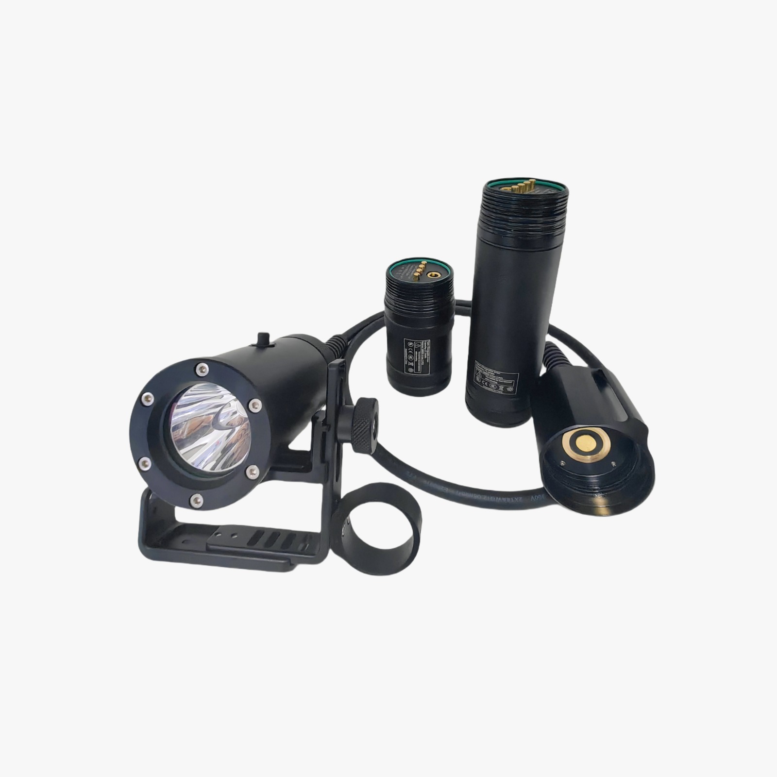 El MDT2K entrega 2.000 lúmenes con un haz concentrado de 7°, optimizado para navegación técnica y entornos con baja visibilidad. Su propuesta diferencial: viene equipado con dos baterías —una canister de 77,7 Wh para inmersiones largas y una compacta de 38,85 Wh para configuraciones ligeras— ofreciendo flexibilidad total en misión. La batería principal logra 240 min al 100% y hasta 1.600 min en modo extendido. Construcción en aluminio anodizado, test real a 220 PSI (~145 m) y solo 1,8 kg operativos. Un foco diseñado para perfiles técnicos que exigen eficiencia energética, versatilidad y fiabilidad absoluta.